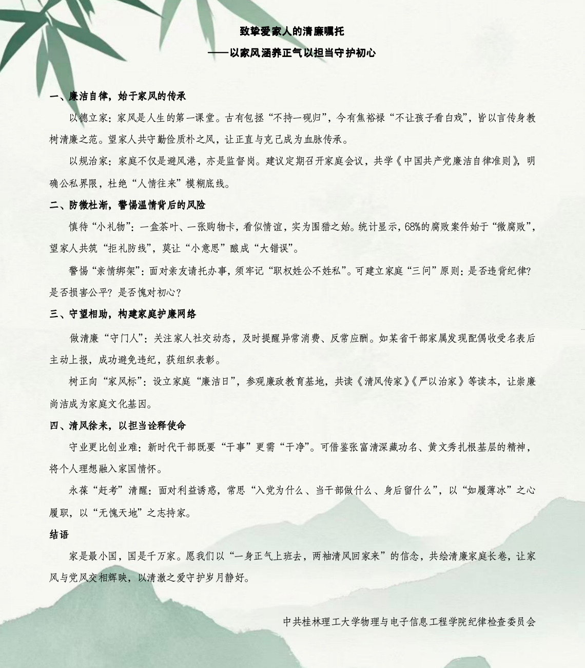 为扎实推进党风廉政建设,筑牢家庭廉洁防线,12月8日,qy千亿国际纪委组织领导干部家属及党员家属前往学校廉政文化园开展主题教育活动。 学院纪委书记蒋琼带领家属们依次参观了廉政文化园的多个主题展区,通过丰富的图文史料、典型案例和互动展示,深入了解党的纪律建设历程与廉洁文化传统。活动特别设置了“廉洁家书”展示环节。现场发放了《致挚爱家人的清廉嘱托》的廉洁家书。家书中强调“以德立家、以规治家”,倡导勤俭质朴、克己正直的家风传承;提醒家属“防微杜渐”,警惕“小礼物”“亲情绑架”等潜在风险;鼓励家庭成员相互监督,当好清廉“守门人”,共同构建家庭护廉网络,并以“一身正气上班去,两袖清风回家来”共勉,凝聚廉洁齐家的共识与力量。 学院纪委书记蒋琼在总结中强调,家庭是反腐倡廉的重要阵地,希望家属们常吹“廉洁风”,当好“廉内助”,共同营造崇廉尚洁的家庭氛围,以良好家风助力学院风清气正政治生态的巩固与发展。此次活动通过沉浸式教育与亲情化倡导相结合的形式,进一步增强了党员干部及其家属的纪律意识与廉洁观念。 现场图片(一) 现场图片(二) 廉洁家书 (一审:夏琳,二审:蒋琼,三审:秦勤忠)